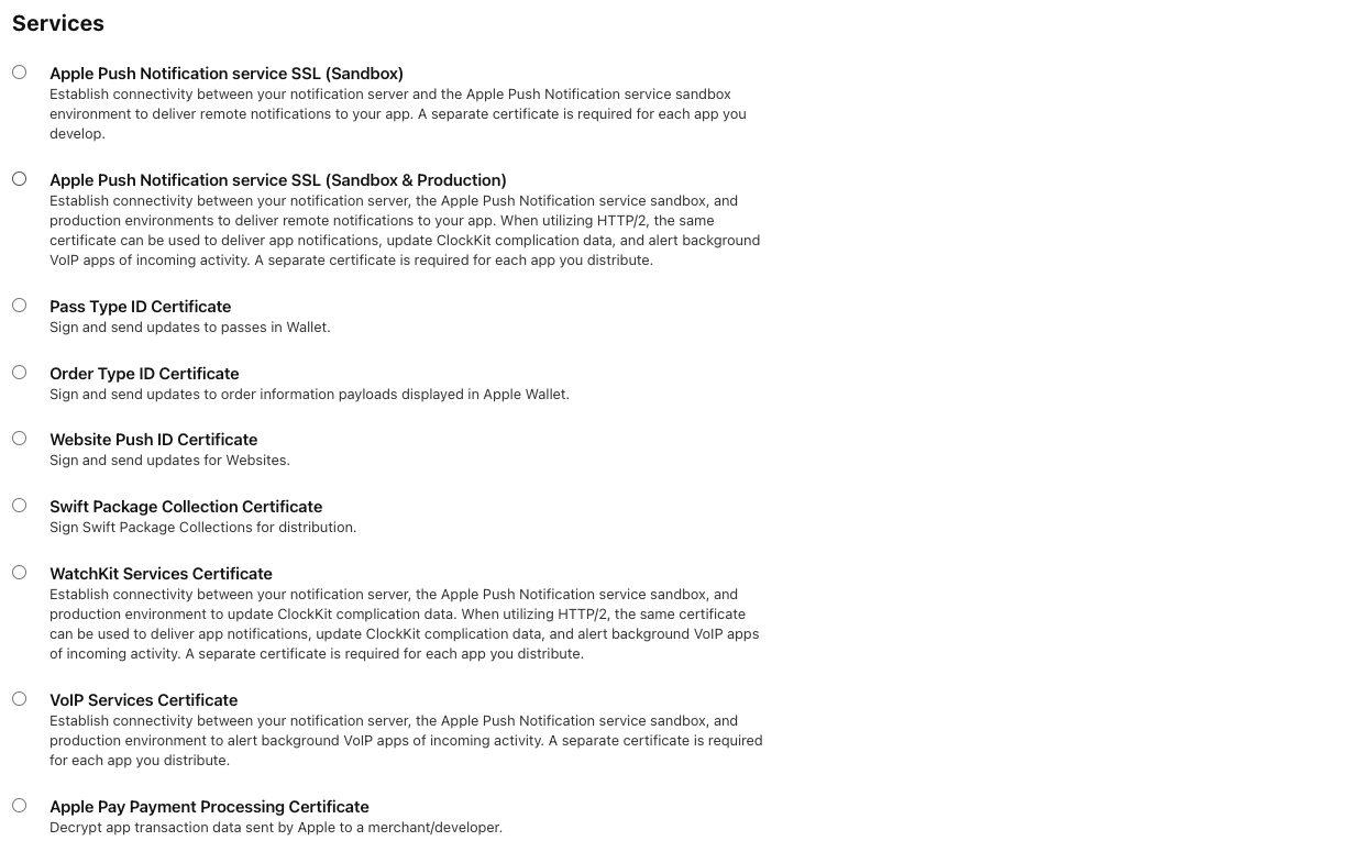2. Development(개발), Distribution(배포), APNs용 중 용도에 맞는 Certificate 선택