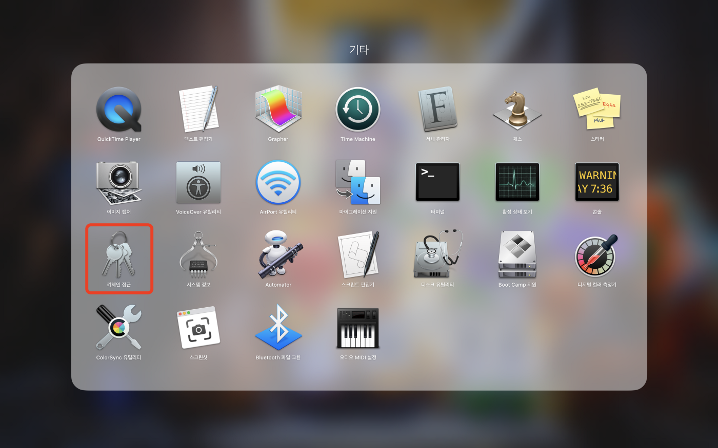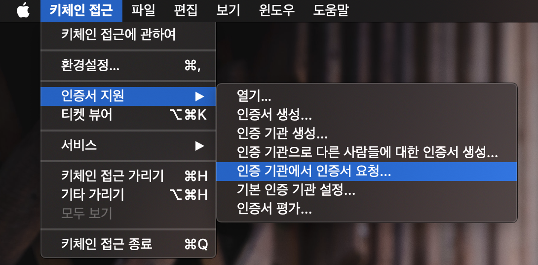 2. 위쪽메뉴에서 키체인 접근 -> 인증서 지원 -> 인증 기관에서 인증서 요청