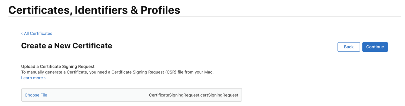 3. 생성한 CSR(CertificateSigningRequest) 등록 후 Continue